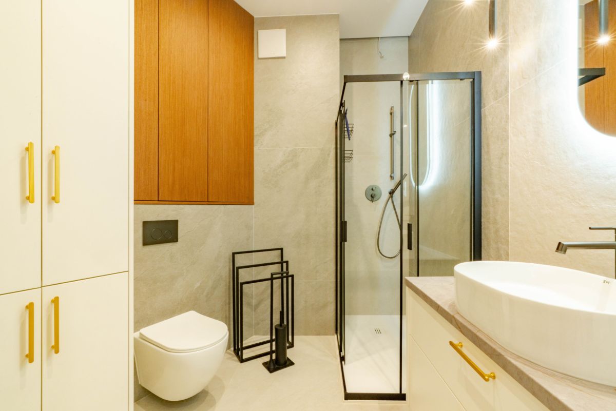 - pełne AGD: zmywarka, lodówka, piekarnik, płyta indukcyjna, pralko-suszarka