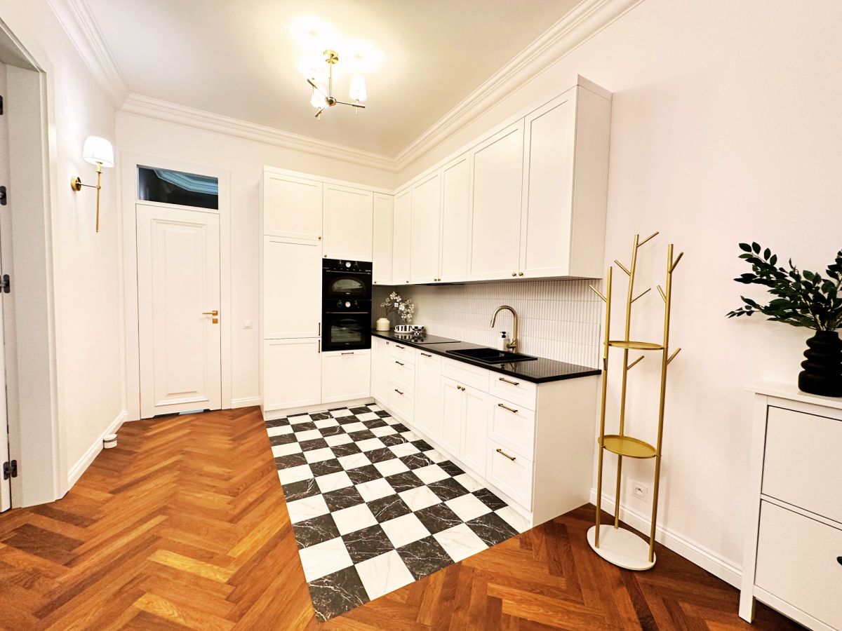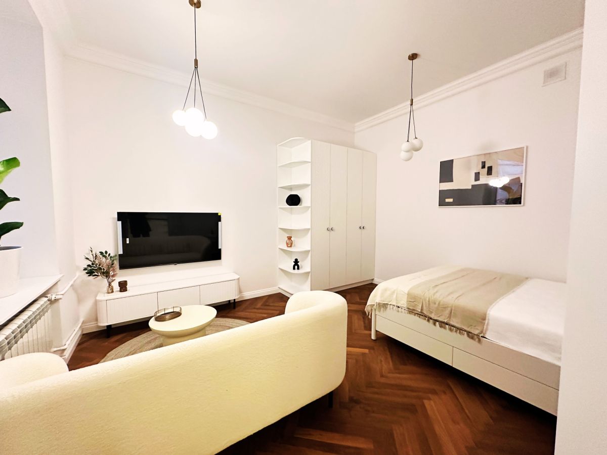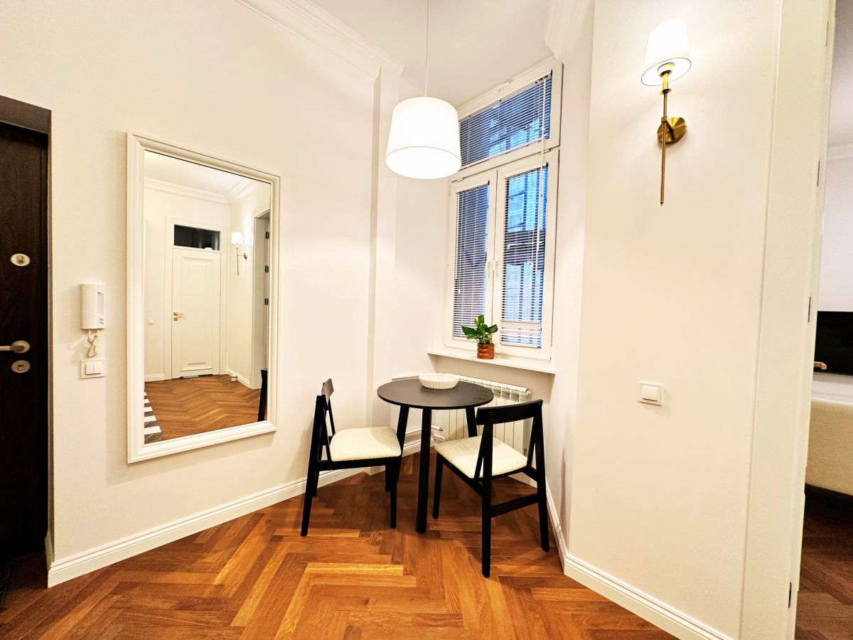 Mieszkanie zostało zaprojektowane w standardzie premium, z wykorzystaniem szlachetnych materiałów oraz precyzyjnie dobranego wyposażenia, które pozostaje w cenie. Wysokość pomieszczeń 3,5 m podkreśla charakter przedwojennej architektury i nadaje wnętrzu wyjątkowy, loftowy majestat.