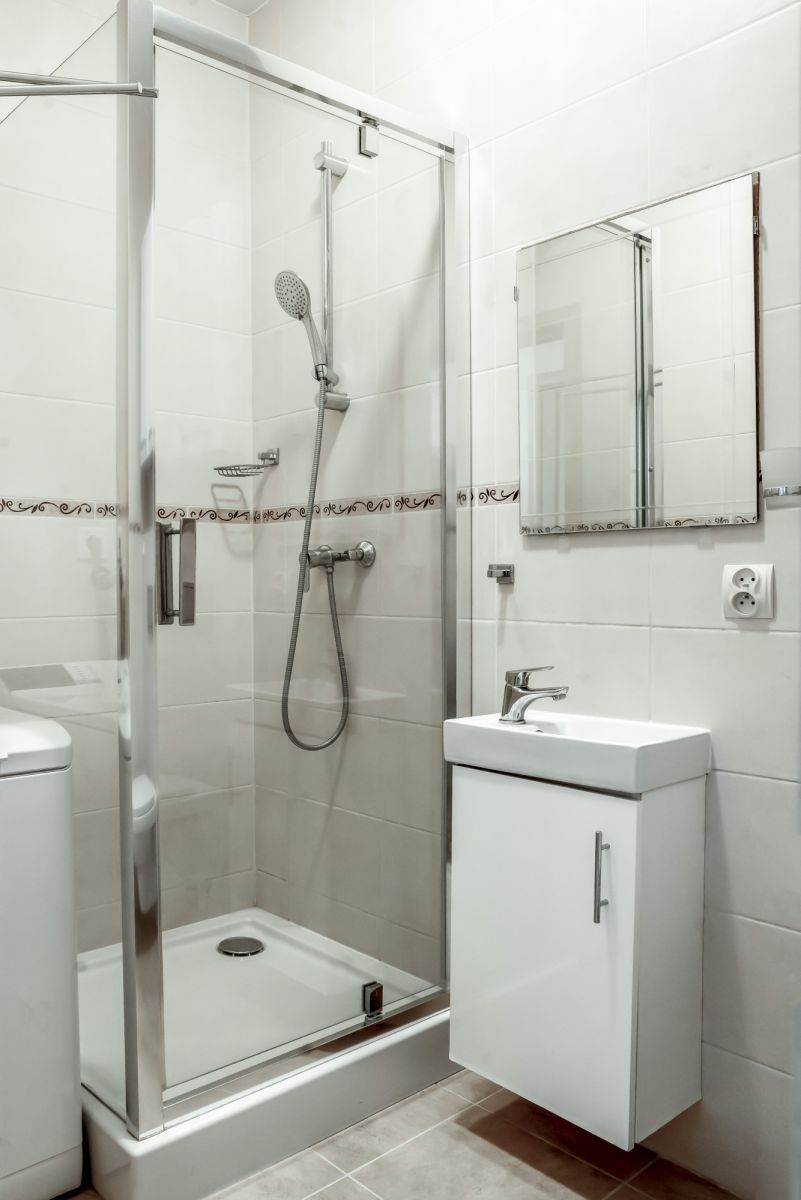 • łazienka z toaletą i kabiną prysznicową, pralka,