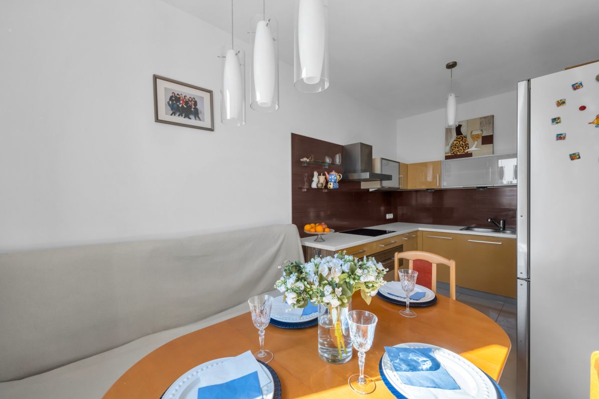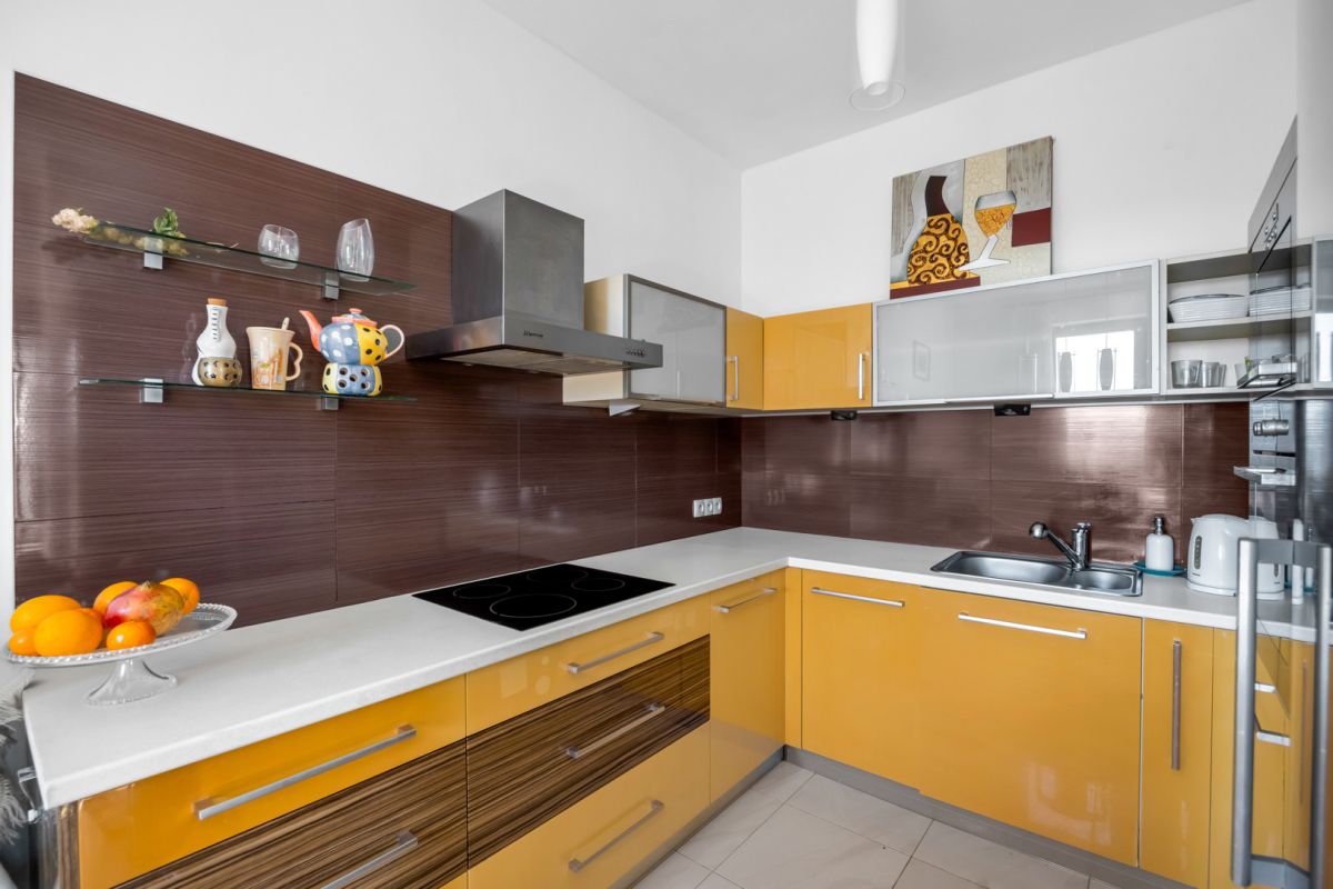 - Funkcjonalna, półotwarta kuchnia (9 m²), praktycznej i przestronnej, wyposażonej w sprzęty AGD: zmywarkę, lodówkę, zamrażarkę, piekarnik oraz płytę indukcyjną.